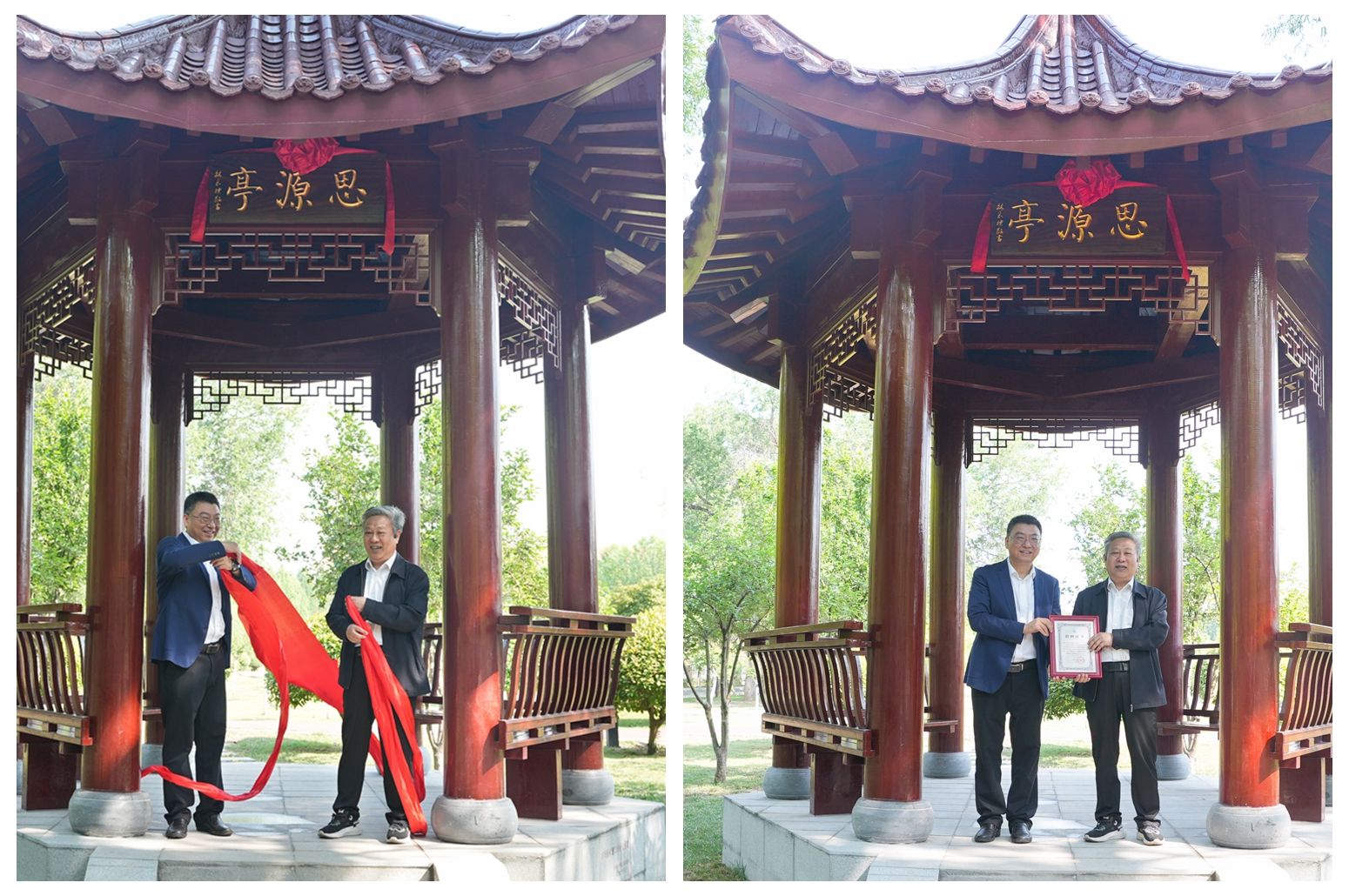 校长赵同谦与校友代表共同为“思源亭”揭牌并颁发捐赠证书