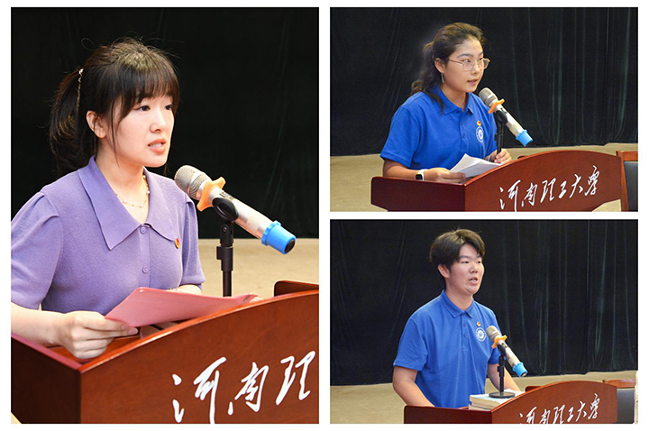 2023年全国暑期“三下乡”社会实践优秀指导教师代表、机械学院团委书记王思思发言,她鼓励同学们以勇气开启实践之门、以团结凝聚实践之力、以信念指引实践之路,并希望同学们以勇气为翼,团结为帆,信念为灯,在暑期社会实践的征途中乘风破浪,书写无愧于时代的青春篇章。2023年全国暑期“三下乡”优秀实践团队学生代表陈静漪同学发言,讲述了自己的实践经历与收获。2024年暑期“三下乡”社会实践活动学生代表安全学院郭丰升同学发言,表达了对即将开始的实践活动的期待与决心。随后,全体实践团队成员在李文哲同学的带领下庄严宣誓,表示将认真学习贯彻习近平新时代中国特色社会主义思想;秉承“明德任责”校训,“好学力行”校风;遵守团队纪律、服从团队指挥;努力在实践中受教育、长才干、做贡献;争做有理想、敢担当、能吃苦、肯奋斗的新时代好青年!
