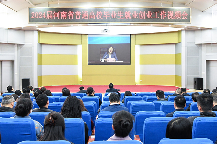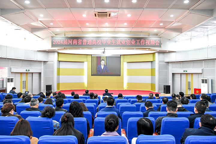 本网讯(通讯员 丁蕴哲/文 李为群/图)为深入学习贯彻全国两会精神,按照教育部2024届高校毕业生春季促就业攻坚行动和省委、省政府第一季度“开门红”决策部署,3月16日上午,2024届河南省普通高校毕业生就业创业工作视频会暨春季校园招聘系列专场活动启动仪式在郑州召开。省委教育工作领导小组秘书组组长、省委教育工委副书记、省教育厅党组书记、厅长毛杰,省人力资源和社会保障厅党组成员、副厅长杨昆锋,省工业和信息化厅二级巡视员王高潮出席会议并讲话。会议由省委教育工委专职委员吕冰主持。我校在力行楼圆形会议室设立分会场,校党委书记邹友峰、校党委副书记解伟,相关职能部门负责同志、各学院主要负责同志、副书记和全体毕业班辅导员参加收看了此次会议,校长赵同谦前往主会场参加会议并在会上作交流发言。