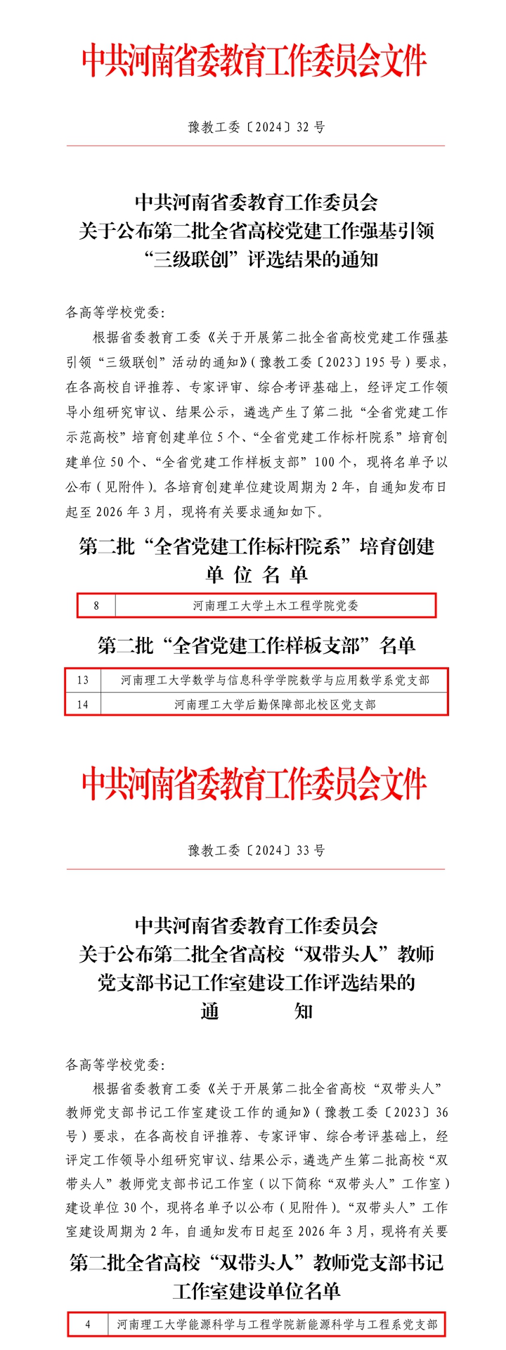 本网讯 (通讯员 梁心愿)近日,省委教育工委公布了第二批全省高校党建工作强基引领“三级联创”等活动评选结果,学校土木工程学院党委获评“全省党建工作标杆院系”,数学与信息科学学院数学与应用数学系党支部、后勤保障部北校区党支部2个党支部获评“全省党建工作样板支部”,能源科学与工程学院新能源科学与工程系党支部获评全省高校“双带头人”教师党支部书记工作室。数信学院管锋彬、物电学院田开龙、资环学院王相龙、电气学院刘一鸣、材料学院汤福佳等5名学生党员荣获全省高校“大学生党员标兵”称号。
