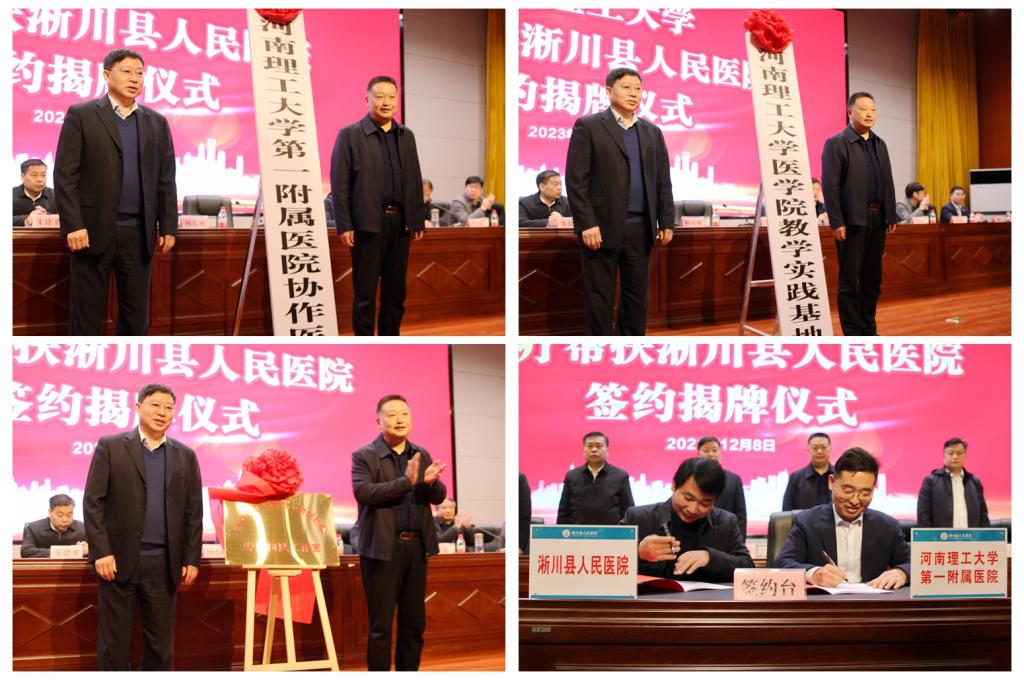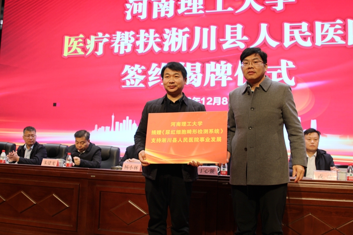 随后,杨小林与丁心强为授予淅川县人民医院的“河南理工大学第一附属医院协作医院”“河南理工大学医学院专业教学实践基地”“河南理工大学第一附属医院专家团队工作室”揭牌,学校第一附属医院党委书记于拥军、淅川县人民医院党委书记丁大鹏共同签署对口帮扶合作协议,软件学院党委书记王伟超向淅川县人民医院捐赠《尿红细胞畸形检测系统》软件。仪式结束后,与会领导到学校第一附属医院义诊现场进行走访查看,并慰问派驻专家王廷焱主任。