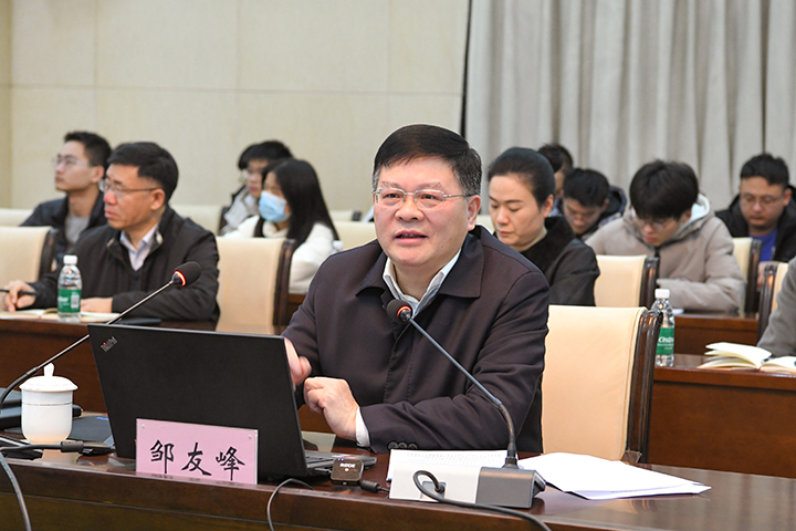 本网讯(记者 段志强 通讯员 秦东杰/文 记者 李为群/图)12月5日,校党委书记邹友峰在力行楼一楼会议室为学生讲授思政课《聚焦教育强国建设 践行高校时代担当》。测绘学院学生代表和校学生会、研究生会学生干部代表共同聆听思政课。