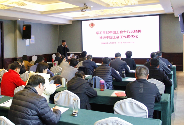 培训期间,河南省总工会干部学校付朝作了题为《学习贯彻中国工会十八大精神,推进中国工会工作现代化》的专题讲座,他从中国工会十八大概况、习近平总书记同全总新一届领导班子成员讲话、《中国工会章程》修正、推进中国工会工作现代化等五个方面为大家全面解读了中国工会十八大精神;在实践教学环节,大家参观了河南省爱国主义教育基地回龙村和新乡南太行党史教育馆。在自学和分组研讨环节,大家学习了新修订的《中国工会章程》以及工会工作制度等材料,围绕工会十八大精神、学校工会制度、新时代高校基层工会工作谈了学习体会和意见建议。结班式上,4位学员代表作了交流发言,欧阳文峰做了总结讲话。