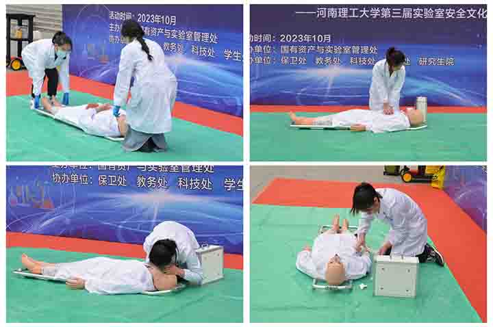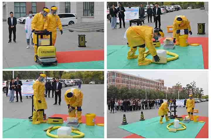副校长翟耀南宣布实验室应急演练活动开始。在重点实验大楼门前,开展危险废弃物泄漏应急演练,模拟废液收集过程中不慎撒漏,学生撤离、逐级上报,然后应急人员到场,穿戴防护服、佩戴呼吸面具、设置警戒区域、吸附清理泄露源、封装废物处理袋、解除隔离,并按照操作步骤对受伤人员进行心肺复苏和紧急包扎。随后转移至综合实验楼615室开展危险化学品泄露处置演练活动,依次进行人员疏散、警戒隔离、紧急喷淋自救、启动应急响应、穿戴防护装备、使用气体浓度探测仪、危化品应急处理、移交实验室、事故调查与整改总结等。