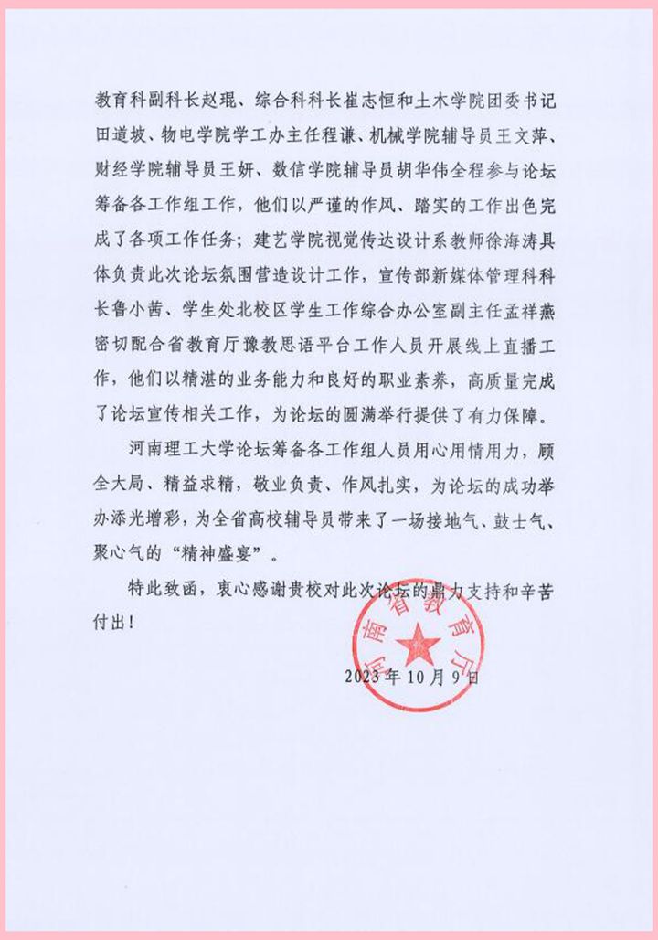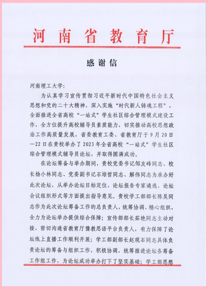 近日,河南省教育厅先后向学校发来两篇感谢信,分别对学校师生在“牢记嘱托践使命 行走中原看巨变”2023年河南省秋季开学思政第一课活动和2023年河南省高校“一站式”学生社区综合管理模式辅导员论坛中,学校领导、相关单位和工作人员的辛勤付出表示衷心的感谢。