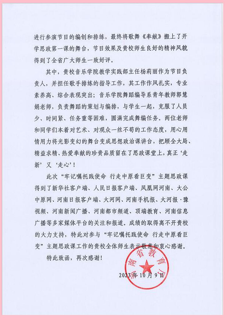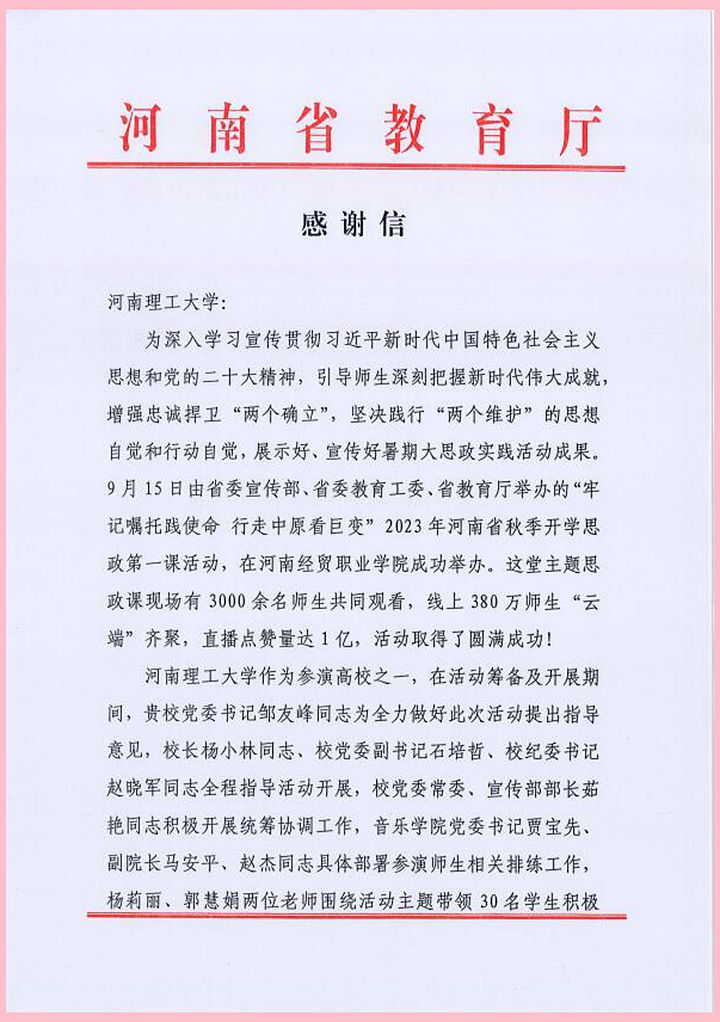 9月15日由省委宣传部、省委教育工委、省教育厅举办的“牢记嘱托践使命 行走中原看巨变”2023年河南省秋季开学思政第一课活动成功举办。我校作为参演高校之一,编排的歌舞《奉献》荣登此次活动舞台。这堂主题思政课现场有3000余名师生共同观看,线上380万师生“云端”齐聚,直播点赞量达1亿,活动取得了圆满成功!