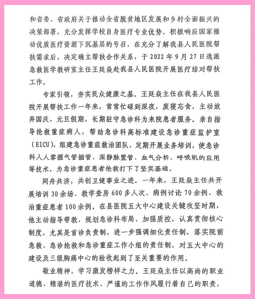 淅川县委、县政府在感谢信中表示,学校精准对接结对帮扶地的迫切需求,积极响应国家优质医疗资源下沉基层号召,充分发挥自身医疗专业优势,提升县人民医院内涵建设,为淅川县的卫生健康事业发展作出了卓著的贡献。学校选派的王廷焱主任在帮扶工作中,长期坚守急诊科为患者服务,组建急诊重症救治团队、指导抢救重症病人、协助建设急诊重症监护室(EICU),累计开展培训30余场、教学查房600多人次、病例讨论70余例、救治重症患者100余例,为急诊重症患者抢救打下坚实基础,对淅川县人民医院的五大中心建设及三级胸痛中心验收发挥了至关重要的作用。王廷焱主任以高尚的职业道德、精湛的医疗技术、严谨的工作作风和忘我的敬业精神,赢得淅川县人民医院全院干部职工尊重,也给淅川县的老百姓留下了良好的印象。在他身上充分体现了河南理工大学人所具备的优秀品质和高尚职业情操!