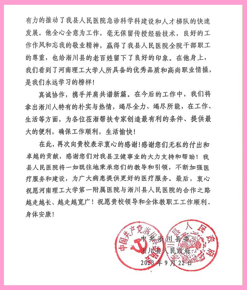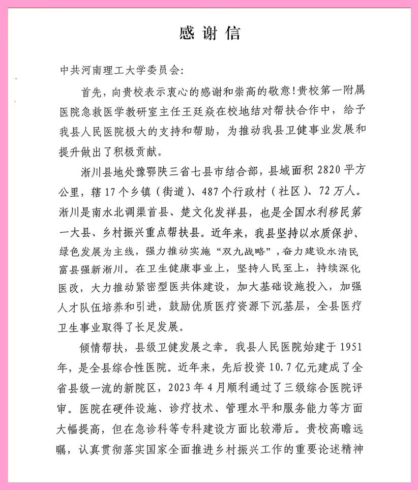 9月22日,中共淅川县委、淅川县人民政府给学校发来感谢信,对学校在校地结对帮扶中为淅川县全面推进乡村振兴工作作出的贡献表示衷心感谢和崇高敬意,对学校选派的第一附属医院急救医学教研室主任王廷焱给予高度评价和充分赞赏。