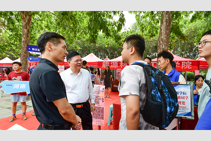 本网讯 (记者 苏丽敏/文 李为群/图)在夏末秋初的理工校园里,114岁的“理”与18岁的“你”撞了个满怀。9月1日至2日,近万名2023级新生从祖国各地来到理工校园,开启人生新征程。学校南、北校区处处洋溢着热烈喜庆的氛围,迎新工作井然有序。9月1日上午,新生入学报到高峰期,校领导邹友峰、杨小林、石培哲、翟耀南等一行深入南北校区,检查指导迎新工作,亲切问候新生及家长。
