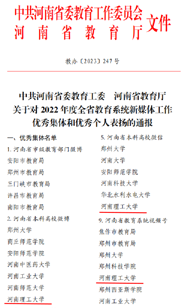 本网讯 (记者 鲁小茜 通讯员 董济民)近日,中共河南省委教育工委,河南省教育厅印发《关于对 2022 年度全省教育系统新媒体工作优秀集体和优秀个人表扬的通报》,学校官方微博、官方微信、官方视频号等荣获河南省教育系统优秀集体称号,学校主题策划《河南理工大学:全链条 多角度“融”出新高度》被评为2022 年度河南省教育政务新媒体优秀案例,学校获奖数量并列全省高校第二名。