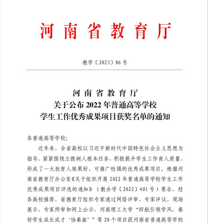 本网讯 (通讯员 赵琨 王文萍)近日,由河南省委教育工委、河南省教育厅组织的2022年普通高等学校学生工作优秀成果项目评选落下帷幕,通过网络评审、专家评议、现场展示、专家终审和网上公示,我校学生工作部(处)遴选推荐的《四航引领学风,奏好学生成长成才“协奏曲”》和《多维互动·深层体验·爱心陪伴——幸福成长训练营》两个项目脱颖而出,分别荣获一等奖和二等奖。 测绘学院党委书记张红霞牵头申报的项目《四航引领学风,奏好学生成长成才“协奏曲”》,以“为党育人、为国育才”为根本,以加强学风建设为主线,通过实施师长导航、学长助航、家长护航、校友励航“四航”工程,多措并举助推学风建设的举措,取得成效显著。工商学院辅导员孙玉平牵头申报的项目《多维互动·深层体验·爱心陪伴——幸福成长训练营》,基于我校大学生学习生活等实际,引入幸福PERMA理论模型,综合运用心理咨询和团体辅导技术,围绕心理特质训练、幸福能力训练两大模块及发掘自身优势、充分认识自我等六个训练项目,探索出来的一套完备的大学生幸福成长训练体系,对大学生幸福心理资本建设具有积极意义。 |