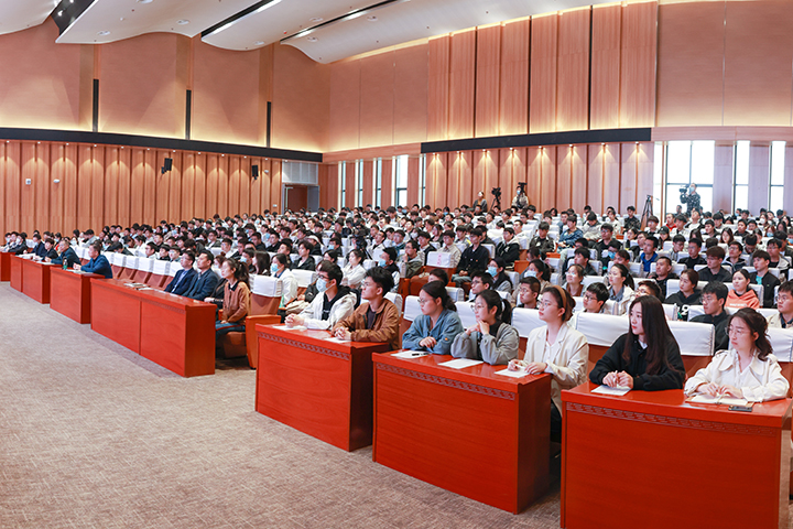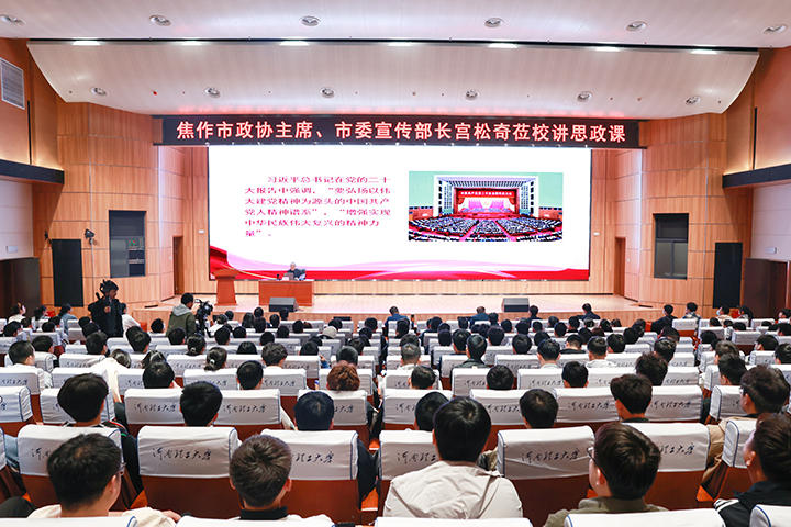本网讯 (记者 裴建伟 通讯员 田清扬/文 郑智源/图)3月31日,焦作市政协主席、市委宣传部长宫松奇在新图书馆A厅讲授题为《从“三特别”的焦作精神和“三不怕”的老山精神感悟中国共产党的精神力量》的思政课。校党委副书记石培哲主持,党办、宣传部、学工部、研工部和校团委负责同志,本科生、研究生、学生干部及青马社成员代表等300余人一同聆听。