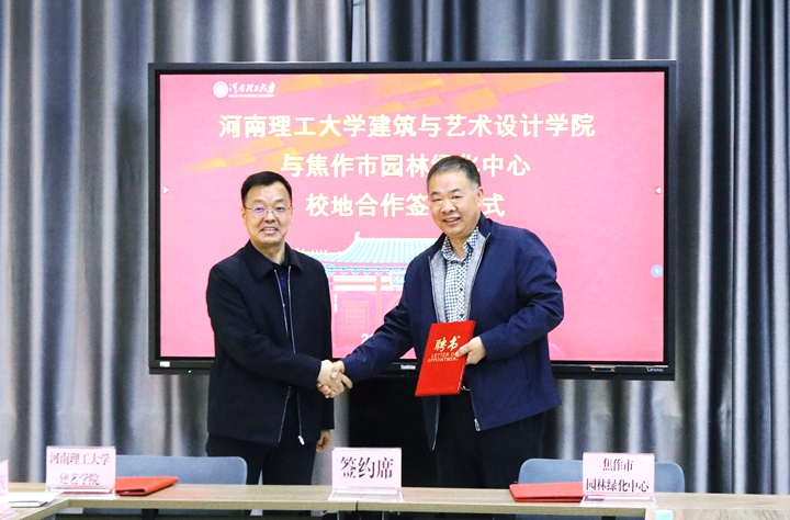郭相春为风景园林专业学位硕士研究生导师刘学峰、胡湛颁发聘任证书。焦作市园林绿化中心副主任刘长林、建艺学院副院长韩宏斌共同在校地合作框架协议上签字。各级领导及嘉宾为签约合作成功送上美好祝福。