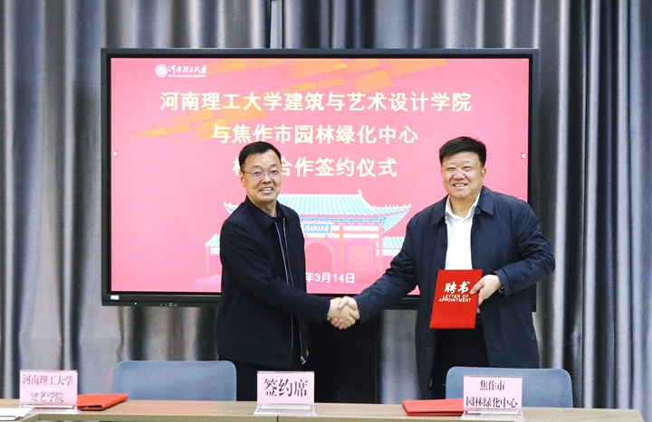 本网讯(通讯员 李盛楠/文 李倩 王宇辰/图)3月15日下午,建艺学院与焦作市园林绿化中心校地合作签约仪式在该院会议室举行。校工会主席郭相春,焦作市园林绿化中心主任刘学峰,焦作市盆景园主任胡湛出席。仪式由建艺学院院长王同文主持。