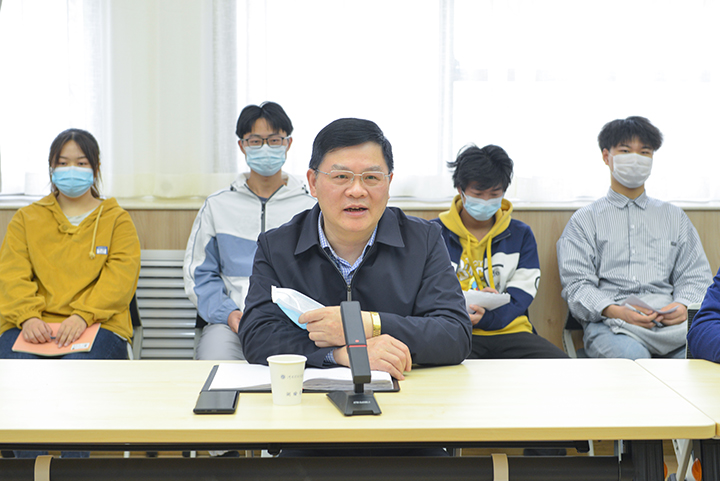 座谈会上,邹友峰介绍了当前疫情防控的严峻复杂形势和学校疫情防控的最新要求,同时也表达了对同学们的殷殷关怀,并鼓励大家围绕学习生活中遇到的困难和疫情防控工作建议畅所欲言。在听取同学们关于业务学习、专业与就业方向选择、科创实践锻炼、心理健康调节、课外活动开展等方面的困惑后,邹友峰在分享自身求学和成长经历的基础上,以宽阔的视野、长远的眼光、丰富的人生经历,耐心细致地为同学们一一解答。最后,邹友峰希望同学们能自觉遵守学校疫情防控规定,做好个人防护,积极适应疫情防控常态化的新形势;调整心态,安心学习生活,合理利用时间,努力提升自我,实现德智体美劳全面发展;艰苦奋斗,不负韶华,克服疫情带来的不利影响,度过充实美好的大学生活。