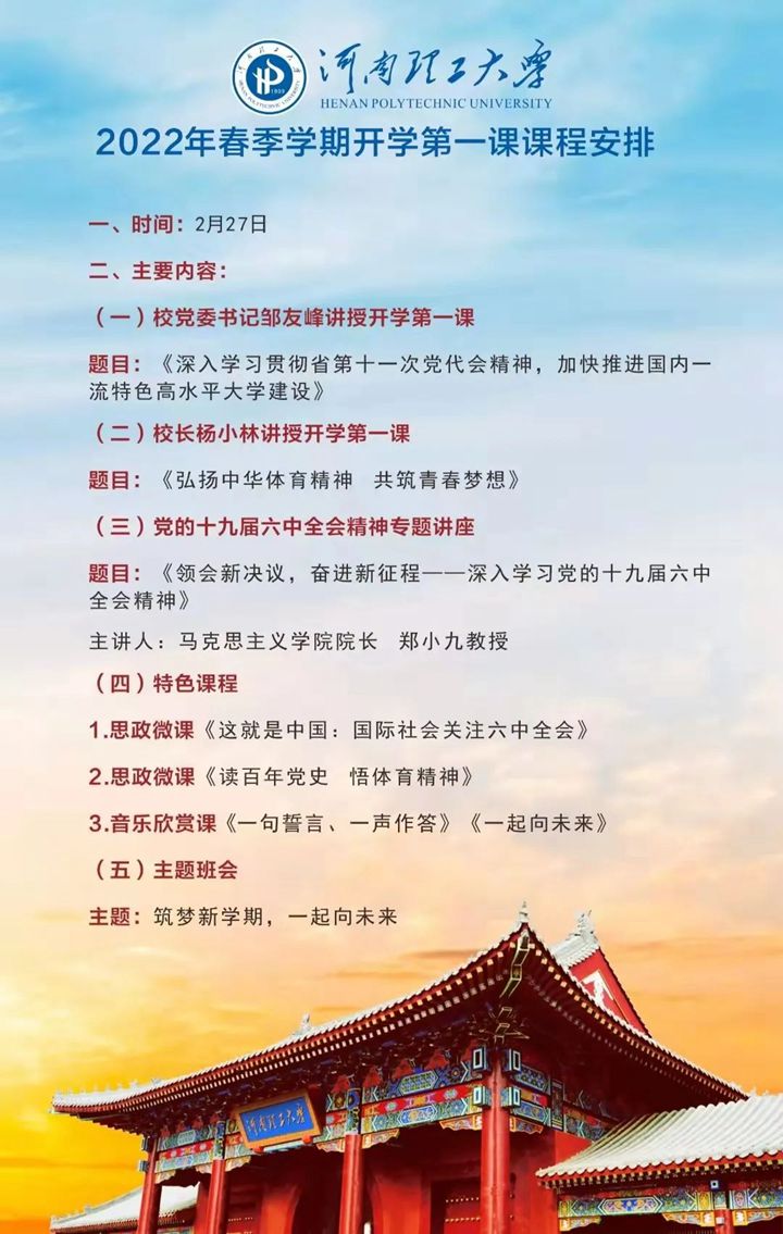 此外,马克思主义学院院长郑小九教授以“历史,主义,人民,奋斗,成就”五个关键词,带领同学们深入学习领会党的十九届六中全会精神。同学们还观看学习了2022河南春季开学第一课以及学校精心设计的思政微课《读百年党史,悟体育精神》《这就是中国:国际社会关注六中全会》,欣赏了音乐学院院长李新现等演唱的原创歌曲MV《一句誓言,一声作答》和该院师生录制的视频《一起向未来》,开展了以“筑梦新学期,一起向未来”为主题的班会。