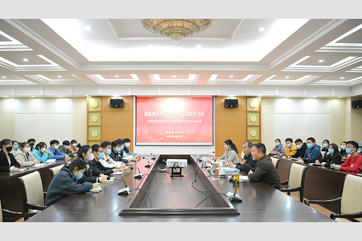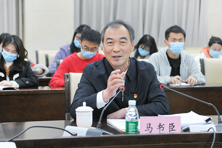 本网讯(通讯员 韩梦凡 杨曦/文 李为群/图)12月21日下午,省委党的十九届六中全会精神宣讲团专家、郑州商学院党委书记马书臣教授走进学校青马社“思政课开讲了”理论课堂,与青年学生面对面交流,为青年学生的成长成才指点迷津。校党委副书记石培哲出席,座谈会由党委宣传部部长、社团指导老师王艳红主持。校青马社50余名学生代表参加座谈会。