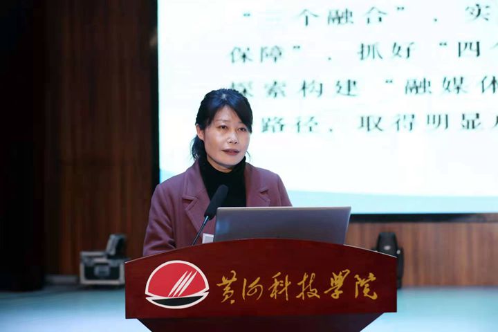 党委宣传部部长王艳红代表学校作题为《推“融”出“新”,持续构建“三全”“三维”全媒体育人体系》的专题发言,汇报展示了学校推进“融媒体+育人”工作的探索实践,以及2022年的主要规划举措。
