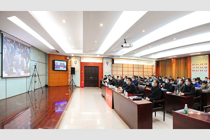 学校在明德楼一楼会议室设立河南理工大学分会场。校领导赵俊伟、赵同谦、翟耀南、沈记全、郭相春参加视频会议。