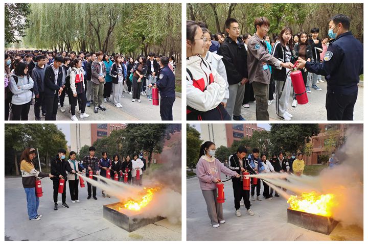 在安全教育理论课后,保卫处消防工作人员还在牡丹园北侧场地为新生进行了灭火器使用的安全实践课。先是介绍手提ABC干粉灭火器使用方法和火灾处理办法,然后由新生们分组感受使用灭火器扑救初期火灾的过程。让新生们在实践中直面火焰、战胜畏惧、积极尝试,确实掌握灭火器的使用方法。