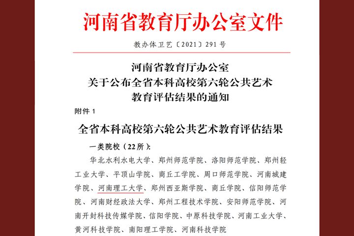 本网讯(通讯员 徐海涛 刘阳阳)近日,河南省教育厅印发《关于公布全省本科高校第六轮公共艺术教育评估结果的通知》(教办体卫艺〔2021〕291号),公布了全省本科高校第六轮公共艺术教育评估结果,我校从此次评估参评的58所院校中脱颖而出,获得一类院校的优异成绩,实现了公共艺术教育工作的历史性突破。