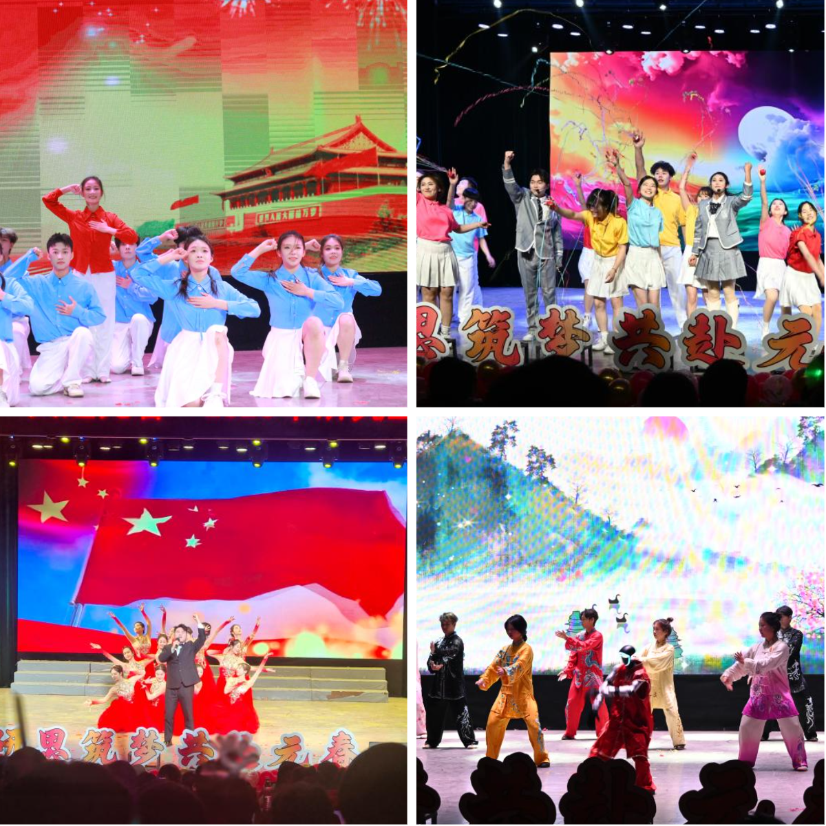 整场晚会节目形式丰富多元、内容精彩纷呈,兼具思想深度与艺术感染力,为现场师生呈现了一场高品质的视听盛宴。歌曲《落叶归根》以深情婉转的旋律,诠释了对中华优秀文化根脉的眷恋与传承;舞蹈《哪吒》以昂扬洒脱的舞姿,演绎出青春活力与奋进力量;体育学院与计算机学院联合呈现的《水墨武术》,将传统武术的刚健沉稳与现代审美的灵动飘逸完美融合,刚柔并济间彰显中华文化底蕴,机器人“笨笨同学”灵动起舞,趣味盎然,成为科技与艺术交融的点睛之笔,赢得全场阵阵喝彩;唱跳《就现在》节奏明快、活力迸发,传递出把握当下、即刻奋进的青春态度;研究生会精心创作的小品《时间都去哪儿了》,幽默诙谐又贴近真实的笔触复刻了研究生科研日常,戳中笑点,引发师生阵阵笑声;歌曲《少年中国说》以童声与青春之声交相辉映,奏响“少年强则国强”的时代强音;舞蹈《唱支山歌给党听》用优美舒展的肢体语言回望峥嵘岁月,抒发对党的赤诚热爱与无限感恩;器乐合奏《万马奔腾》巧妙融合西方乐器的理性架构与东方乐器的写意神韵,演绎出文明互鉴的壮美篇章;合唱《我爱你中国》旋律恢宏、情感真挚,唱出全体师生对祖国的深沉眷恋与赤子情怀。最后,晚会在歌伴舞《再一次出发》中推向高潮,昂扬的旋律、奋进的舞姿,映射出全体理工研究生整装待发的崭新姿态和在新征程上续写新辉煌的决心。