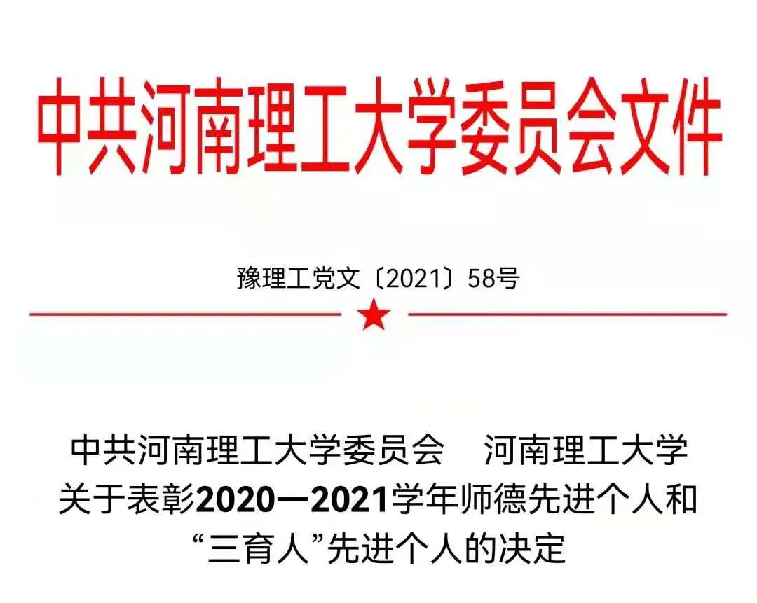 他坚守以德立学、以德施教理念,秉持情系教坛、严谨治学精神,始终将“立德育人”作为工作出发点,贯穿于工作全过程。先后荣获河南省“教学标兵”、河南理工大学“二级元培名师”“示范教师”“优秀党员”“优秀教师”“精神文明先进个人”和焦作市“优秀教师”等称号。