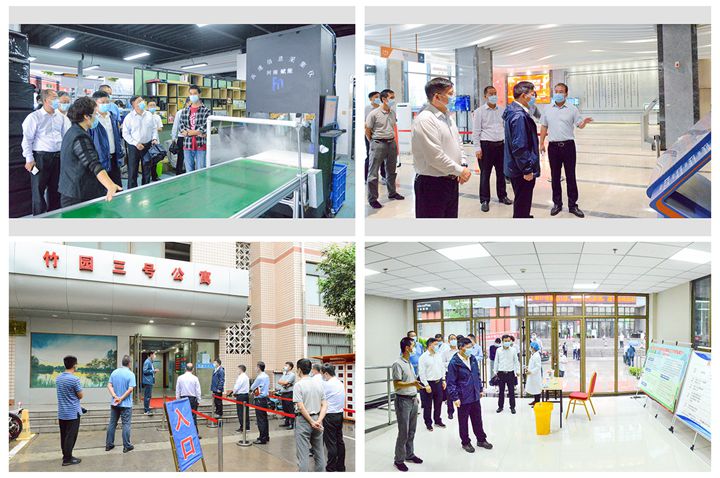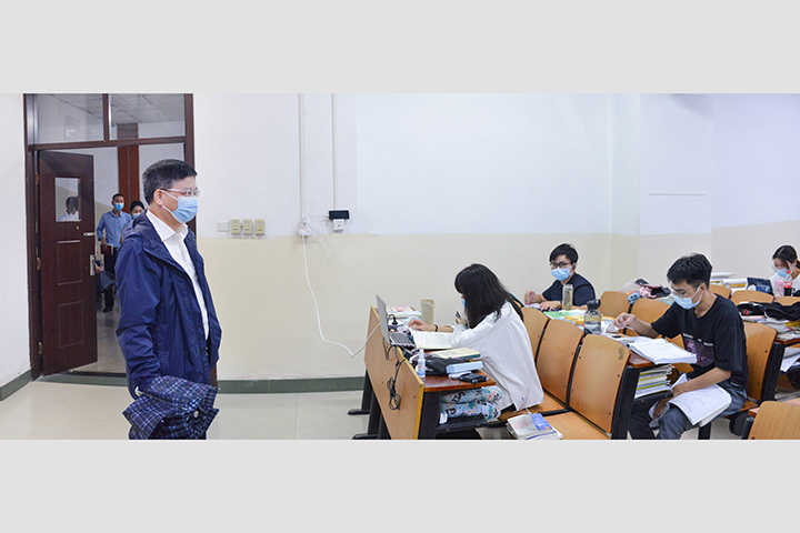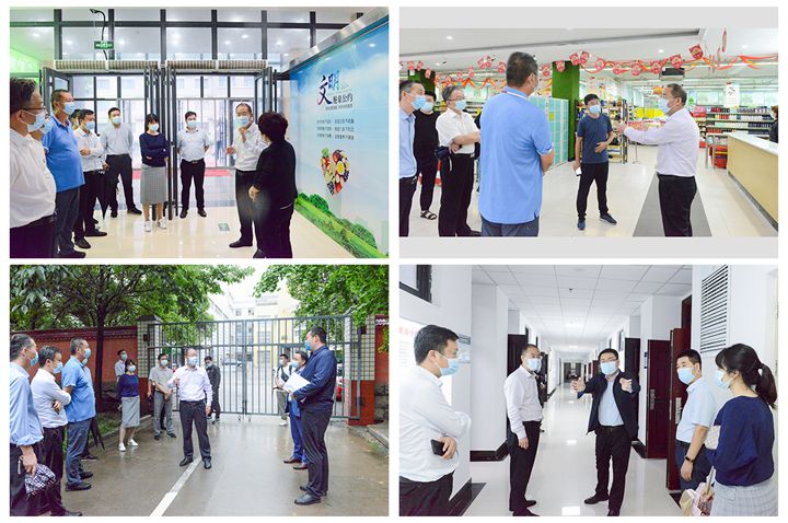 邹友峰、杨小林一行先后来到南校区南大门、三号教学楼、快递中心、第二图书馆、竹园三号宿舍楼、隔离观察区、学海餐厅、博雅苑超市、留学生外教公寓、国家重点实验室大楼等地。按照疫情防控要求,检查指导组全程佩戴口罩,在完成消毒、测温等流程后有序进入场地。每到一处,邹友峰、杨小林都详细询问各单位为应对学生返校可能出现的突发情况所做的准备工作,认真听取单位负责人的工作汇报,并对接下来的工作提出要求。