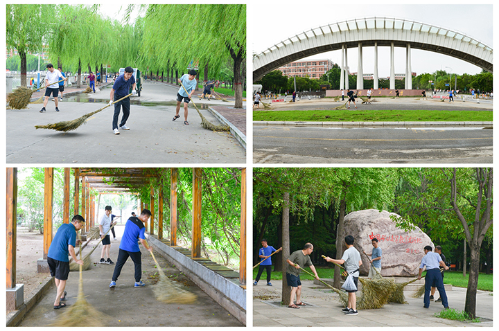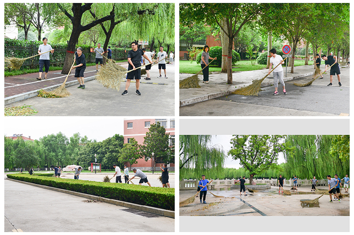 “你们去那边清理绿地上的枯枝杂叶,我们在这边清扫路面杂物……”赵俊伟一行带领在校教职工,从明德楼出发,分为南、北两队,沿着馨月湖,分别对滨湖路、南大门内外、校训校风广场、行政楼、力行楼前等地汛后遗留的垃圾物进行全面清理打扫。老师们拿起扫帚,一边清理路面和绿地内的淤泥,一边清扫路面的落叶及杂物,力争尽快恢复校容校貌。清扫过程中,大家分工明确,方法得当,效果明显,校园的路面、绿地、大门口、广场等处,很快恢复了往日的良好面貌。