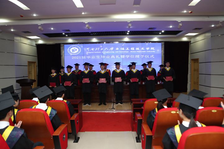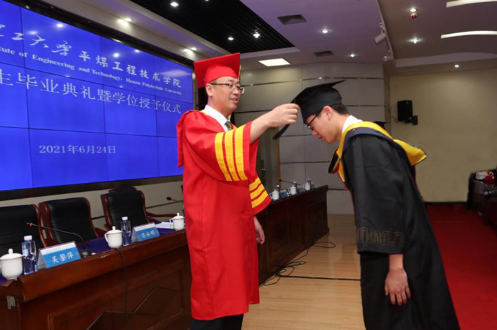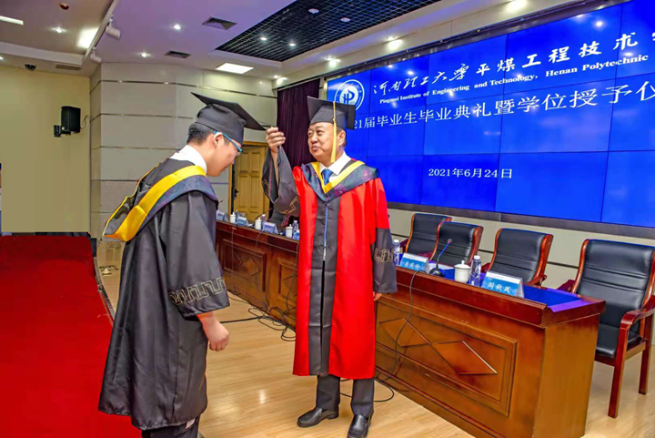 6月24日上午,河南理工大学平煤工程技术学院2021届毕业生毕业典礼暨学位授予仪式在学院图书馆报告厅举行。副校长沈记全,中国平煤神马集团副总经理江俊富,平顶山工业职业技术学院党委书记毕晓阳、校长李树伟,平煤工程技术学院副书记吴志钟、副院长张君出席典礼。校办、学生处、教务处、招就处负责同志,平煤工程技术学院全体教职工、2021届毕业生及部分学生代表参加仪式。仪式由毕晓阳主持。