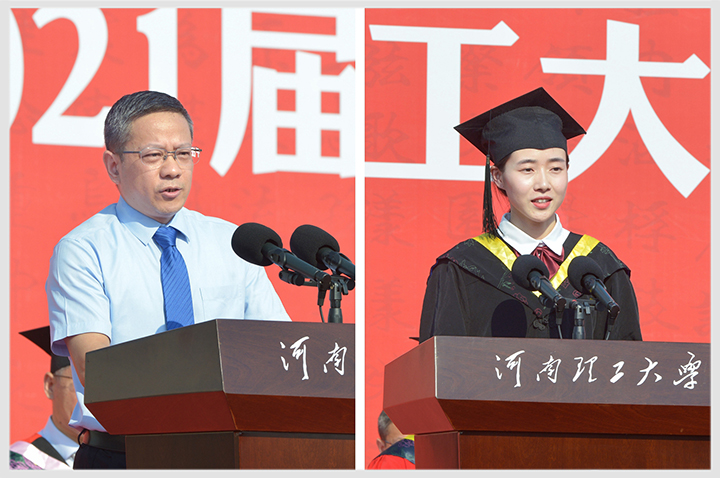 教师代表、河南省教育厅学术技术带头人、河南省高校科技创新人才、资环学院教师潘结南发言,希望同学们明德任责,秉持家国情怀,肩负历史使命,努力创造新时代民族复兴的新篇章。机械学院毕业生代表陈亚茹在发言中分享了四年大学生活的经历与收获,表达了对学校、老师、同窗真挚的感恩和留恋。