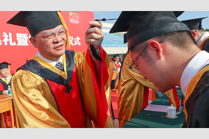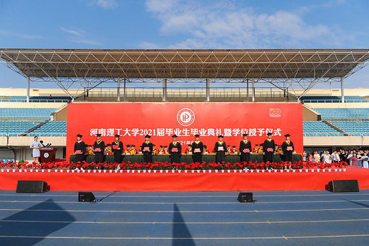 校党委副委书记解伟宣读了2021年河南省优秀应届大中专毕业生表彰决定;校纪委书记陈自录宣读了2021届博士、硕士研究生毕业证书颁发决定和硕士学位授予决定;副校长赵俊伟宣读了学校2021届本专科毕业生毕业证书颁发决定和本科毕业生学士学位授予决定。主席台就坐的学校领导依次为2021届省级优秀毕业生代表颁发荣誉证书,为毕业生代表颁发学位证、毕业证,拨正流苏并合影留念。