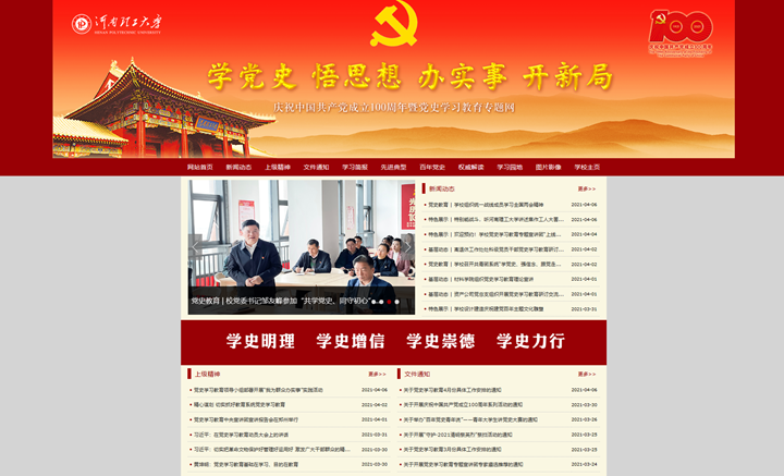 本网讯(记者 张勐)3月29日,由学校党史学习教育领导小组指导,领导小组办公室(党委宣传部)组织设计、信管中心和计算机学院给予技术支持的学校庆祝建党百年暨党史学习教育专题网站(http://www6.hpu.edu.cn/xxds)正式上线。
