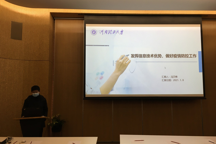 会上,我校信息化建设与管理中心副主任冯文峰代表学校作题为《发挥信息化技术优势,做好疫情防控工作》的报告。汇报了2020年度我校在疫情防控期间有效开展信息化防疫的相关内容,包括发挥优势,做好数据收集,提供防疫决策支持;冲锋在前,助力复学返校,实现身份精准核验;通力协作,传递主流声音,做好防控宣传教育;扎实工作,做好技术支撑,积极建设智慧理工等四个方面。