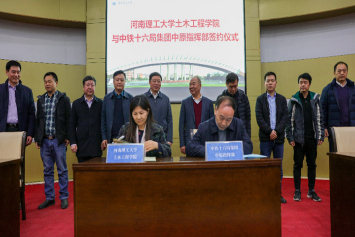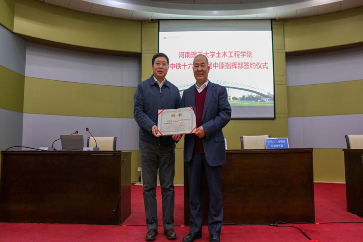 学术报告结束后,校长杨小林代表学校为马栋颁发聘书,土木工程学院院长丁亚红和中铁十六局中原指挥部党工委书记张鸿鹏分别代表双方单位在协议书上签字。今后,双方将在合作过程中发挥各自优势,真正将科学研究、人才培养和企业发展融合在一起,实现校企共赢。