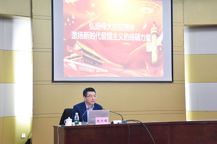 赵同谦从弘扬抗疫精神、坚定“四个自信”;高举爱国主义伟大旗帜,奋力谱写时代新篇章;做爱国主义精神的弘扬者和践行者等三个方面作了精彩报告。报告中,他着重讲解了以“生命至上、举国同心、舍生忘死、尊重科学、命运与共”为核心的伟大抗疫精神,阐述了为什么要坚定“四个自信”并详细解读了爱国主义精神的本质及内涵。随后他为研究生提出三点希望:一是要坚定信念,加强品德修养,努力践行社会主义核心价值观;二是要严格遵守学校疫情防控相关规定,服从大局,听从指挥;三是要学好专业知识,努力潜心科研,在学术上取得进展。紧接着,赵同谦结合研究生学习和科研的特点,要求广大研究生明确学习目标,端正学习态度,主动学习和创造知识,提前做好文献综述和开题准备。同时,及时、主动地向导师汇报自己的想法,认真听取导师的意见和建议,在学习和科研中更要恪守学术道德和学术规范。