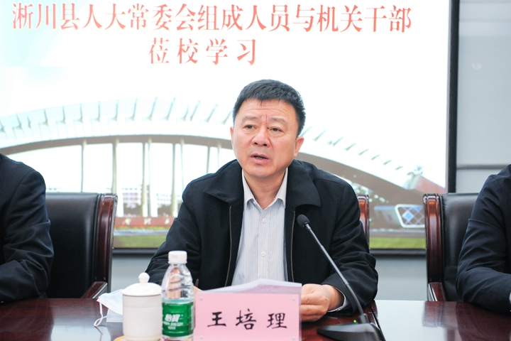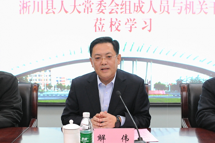 解伟致词,向淅川县人大常委会主任王培理及参加本次培训的淅川县人大机关干部表示热烈的欢迎。并介绍了我校的历史沿革、办学规模、师资力量、学科特色等方面的情况。他指出,近年来,淅川县脱贫攻坚工作取得了显著成效,生态林果产业发展势力良好,工业企业特色鲜明,教育事业飞速发展,连年高考升学率名列河南前茅。今年2月,河南省政府宣布淅川县正式脱贫摘帽。在此,向大家致以热烈的祝贺和崇高的敬意!