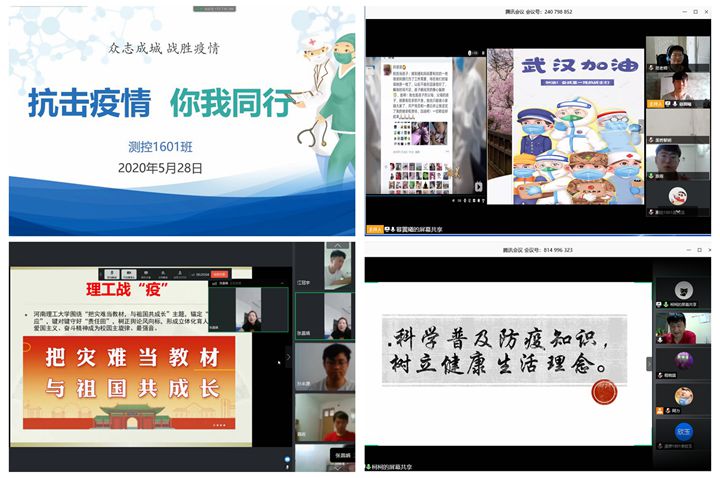 各学院结合年级、专业、班级实际,整合育人资源,创新班会形式,利用企业微信、腾讯会议、在线直播、视频连线、线上讨论等多种形式学习宣传习近平总书记关于打赢疫情防控阻击战的重要指示精神,教育引导学生弘扬爱国主义精神,树立与时代主题同心同向的理想信念,使班会生动活泼、入脑入心。应急学院、工商学院等学院主题班会通过班级观看大型电视政论片《雄关》,展现河南儿女凝心聚力构筑中原防线,号召学生临“疫”不畏,听教导,敢担当,齐心协力共抗疫;机械学院、文法学院等将“美育云端课堂”融入主题班会,以《最美的期待》《长江,长江,我是黄河》《拥抱春天》等抗疫宣传歌曲作为班会开头曲和结尾曲,带领学生合唱,以美育人、以文化人;资环学院等通过观看校党委书记邹友峰讲话视频《在战疫中淬炼成长》、校长杨小林讲话视频《持续做好防控 共创美好未来》、第一附属医院重症医学科主任、省第二批援鄂医疗队焦作医疗队队长王建峰专题微课《使命所系职责所在,白衣执甲映初心》等,宣传学校疫情防控期间采取的得力措施、积累的成功经验、涌现的先进典型,激发学生爱校热情;计算机学院、测绘学院等组织在线讨论,学生踊跃发言,畅谈参与社区、乡镇政府的防疫志愿活动和为抗疫捐款捐物的先进事迹,展现团结一致抗击疫情的生动实践;财经学院、化工学院等分享个人防护54字守则,普及防疫知识,辅导员和班主任叮嘱学生放平心态,适应在线学习,做好常态化疫情防控;能源学院等通过已返校毕业生线下参会和未返校毕业生现场连线相结合的方式,引导毕业生以良好的精神风貌和饱满的工作热情走出校园、迈入社会,努力成为担当民族复兴大任的时代新人。