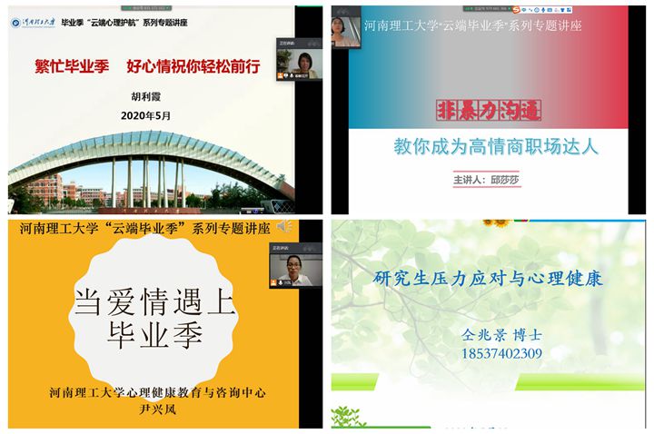 本次专题讲座以腾讯会议为载体,采用线上方式进行,共遴选了胡利霞、仝兆景、尹兴凤、孙玉平、邱莎莎等5位心理健康教育专业教师,讲座内容涉及毕业生的情绪管理、研究生心理压力管理、爱情困惑、就业心理和职场人际沟通等方面。
