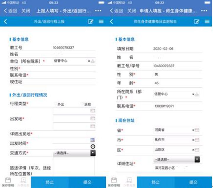 目前有“每日健康上报”和“外出/返校行程上报”两个服务流程。服务实现PC和移动端的多终端、全天候信息采集,准确掌握师生当前住址,联系方式,身体状况,外出/返校时间、交通工具、车次,返校后是否进行自我隔离等信息,实现采集信息的统计汇总,自动生成《疫情每日监测统计表》《疫情未上报人员明细表》《身体状况异常明细表》,实现按权限分级查询,实现各自责任范围的密切关注,助力学校疫情排查和防控。现阶段该系统用于全校教工疫情信息收集和整理工作,未来根据学校学生管理部门需求,可定制开发针对学生的疫情信息收集系统。为学校利用大数据技术对疫情发展进行实时跟踪、重点筛查、有效预测、科学防治、精准施策提供数据支撑。