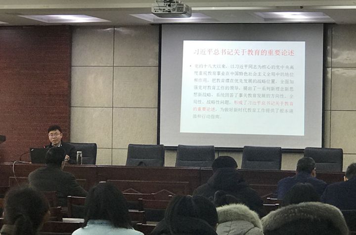 1月11日上午在文综楼518,学校纪委书记陈自录作了题为《重廉洁、讲奉献——用初心和使命守护师道尊严》的专题讲座,强调了重廉洁、讲奉献是新时代高等教育工作者坚守初心、育人报国的内在要求;是新时代高等教育工作者担当使命、立德树人的人格力量;是新时代高等教育工作者人生出彩、生活幸福的必然途径。下午学院党委书记陈昊以“学习卢永根、朱有勇院士先进事迹,做‘四有’好老师”为题,带领大家共同学习研讨卢永根、朱有勇院士的先进事迹。1月12日,社科处处长牛海鹏在文综楼518作了题为《社科类科研项目申报及其相关文件解读》的专题讲座,为老师们的科研申报进行答疑解惑。下午在圆形会议室,教务处处长沈记全以《建设高水平本科教育,提高人才培养能力》为题,结合国家文件对学校本科教育提出了一些建设性意见。