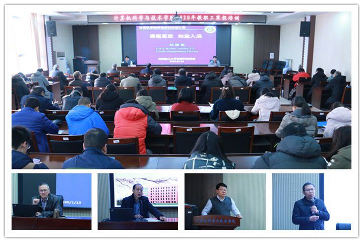 13日上午,计算机学院院长孙君顶作了题为《2019年度总结暨学院发展思考》的报告,他从学院师资队伍,教学工作,学科、学位点与平台,研究生工作四个方面深入剖析了学院现阶段发展过程中存在主要问题以及差距,并向与会教师详细阐述了解决问题的思路以及学院今后的发展方向与方案计划;院党委书记朱天明作题为《坚守初心使命,树立优良师德》,他从新时代树立优良师德的重大意义和新时代树立优良师德的方法途径两个方面与参会老师分享了新时代树立优良师德的认识和体会,他强调,广大教师要深入学习,明确要求;对照标准,强化修养;明确底线,守正扬清积极教学育人,争做“四有”好老师。下午,特邀资环学院教授、博士生导师郑德顺作题为《课程思政,如盐入汤》的报告,他从课程思政与思政课程关系、挖掘融合专业思政元素、润物无声设计教学方法、教师立德树人教学育人等4个方面展开,从思政课程存在的问题到教学内容,再到课程思政的教学方法,结合《地质学》课程挖掘专业课里的家国情怀,相得益彰,引人入胜。14日上午,特邀河南省教学名师土木学院王钦亭老师作题为《在线开放课程的建设及应用实践》的报告,他从我国在线开放课程的发展过程,MOOC建设过程,MOOC应用实践,MOOC的运行体会及展望四个方面为老师们详细讲解了在线课程项目的建设方法与实践应用。下午,教师们共同学习时代楷模卢永根、朱有勇院士先进事迹,为广大教师树立了榜样。