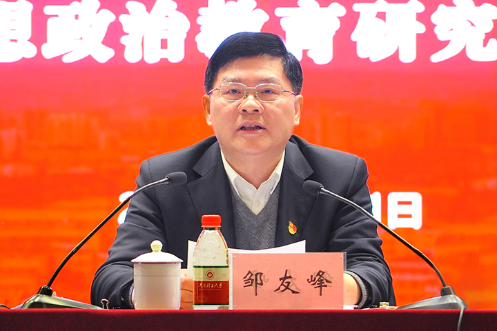 校党委书记邹友峰发表讲话。他指出,思想政治工作是一切工作的生命线,要从统揽“四个伟大”的高度,切实增强思想自觉、政治自觉和行动自觉,充分认识做好新时代思想政治工作的重要意义。要紧紧把握新时代思想政治工作的新形势新特点,切实把工作做新做活做实。就深入推进新时代学校思想政治工作改革创新,他提出了四点具体要求:一是要把政治建设放在首位,全面加强党对思想政治工作的领导,履行好管党治党、办学治校的主体责任,营造风清气正的良好政治生态和育人环境。二是要把健全机制作为重点,切实完善齐抓共管的“大思政”工作格局,坚持全校上下一盘棋思想,形成同频共振的工作合力。三是要把改革创新贯穿始终,不断增强思想政治工作的实际效果,把解决思想问题与解决实际问题结合起来,使思政工作接地气、有人气。四是要把从严管理作为基本要求,筑牢意识形态安全的坚强防线,不断巩固壮大校园主流思想舆论,确保学校和谐稳定。
