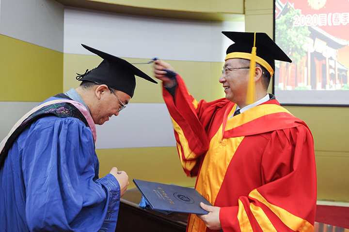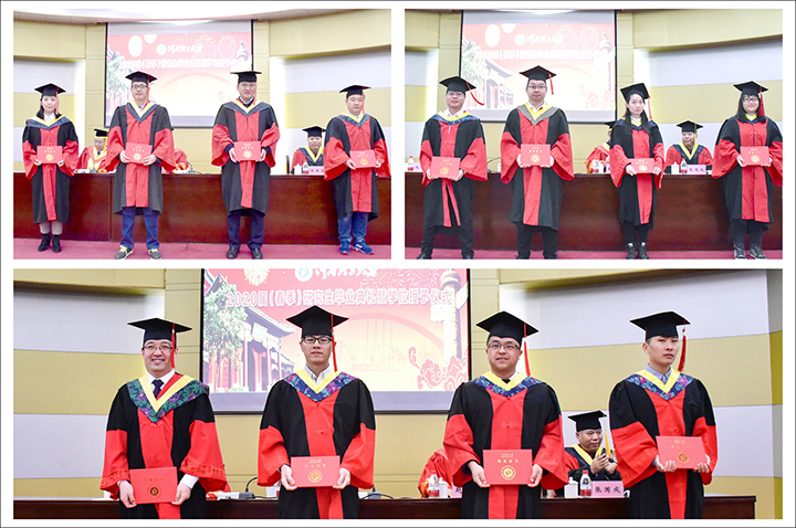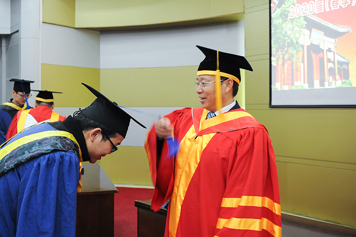 在学位授予仪式阶段,校领导为全体2020届(春季)硕士毕业生拨流苏,颁发学位证书并一一合影留念。