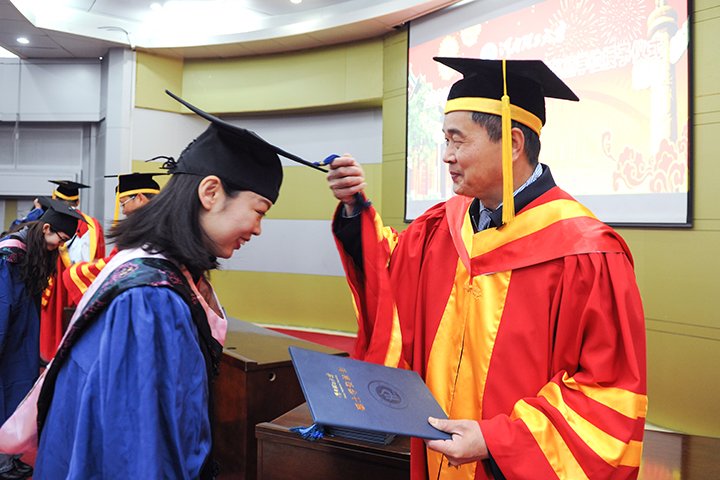 校长杨小林为硕士毕业生拨流苏,颁发学位证书