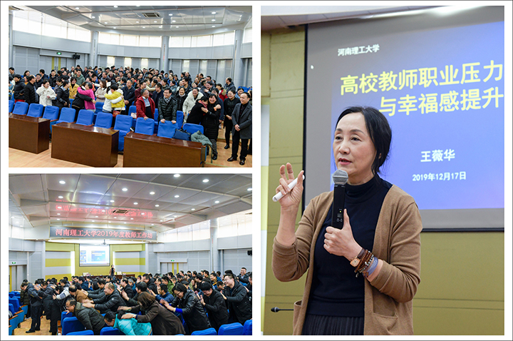 12月17日,由著名积极心理学专家、幸福力导师、中国地质大学教授王薇华作题为《高校教师职业压力缓解与幸福感提升》的报告。王薇华首先邀请全场教师做一套简单易操作的微笑瑜伽,通过现场示范和指导让大家体验如何面带微笑,并请相邻教师互相拥抱,感受幸福的力量。王薇华理论联系实际,坚持以习近平新时代中国特色社会主义思想为指导,聚焦高等教育立德树人教书育人的使命,结合自身的研究和生活体验,从教育培养价值观、幸福感、幸福力讲到积极人格品质;从语善、视善、行善讲到要有一张好嘴、一双慧眼、一双暖手;从提升幸福感的使命感讲到幸福力的自助自救,再讲到奋斗本身就是一种幸福;并指出大家要多读书,具有感恩心,最后总结出幸福都是奋斗出来的!王薇华通过大量生活中的真实案例,教给大家提升幸福力的方法和技巧。