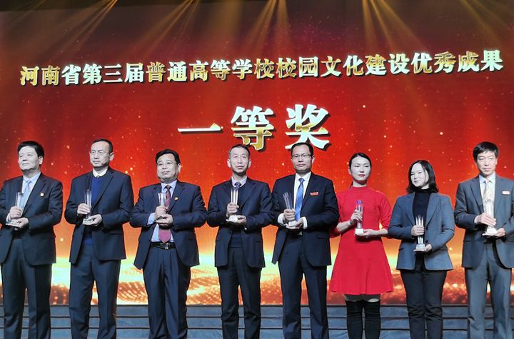 我校党委副书记安士伟出席活动并上台接受省教育厅副巡视员吕冰颁发的“十佳优秀学生工作品牌”奖牌。学生工作部(处)部(处)长黄保金上台接受省教育厅学生处处长李培俊颁发的校园文化建设优秀成果一等奖。在2019年评选活动中,我校成绩可喜,斩获多个奖项。其中由校宣传部、学工部推荐、图书馆申报的品牌项目《“阅读文化行”活动》荣获了河南省第三届普通高等学校校园文化建设优秀成果一等奖;由学工部推荐、材料学院申报的《红色话剧展演活动》不仅荣获了第三届“大美学工”十佳优秀学生工作品牌,还同时荣获河南省第三届普通高等学校校园文化建设优秀成果二等奖。