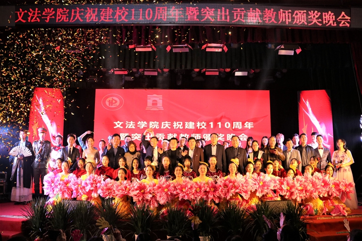 10月17日晚,文法学院在北校区小礼堂举行了“砥砺奋斗七十载,百十荣光共思源”庆祝建校110周年暨突出贡献教师颁奖晚会。校纪委书记陈自录出席晚会,相关职能部门负责人、返校校友、文法学院全体师生等欢聚一堂,共享视觉盛宴,学院融媒体对晚会进行了同步网络直播。