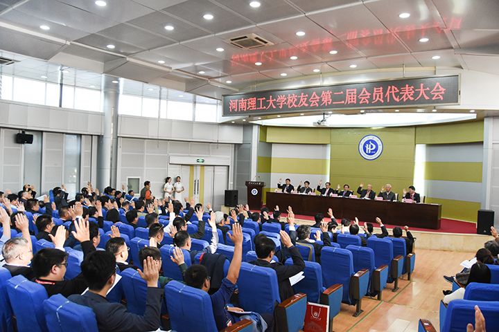 校党委副书记安士伟宣读《河南理工大学校友会章程》修订说明。副校长赵俊伟代表第一届理事会作工作报告。工作人员宣读第二届理事会负责人、理事建议人选名单。大会审议并通过了第一届理事会工作报告和《河南理工大学校友会财务管理制度(草案)》。投票表决通过了校友会修订章程。经过无记名投票选举,决定杨小林为学校校友会第二届会长,并选举产生了新一届副会长、理事、秘书长、副秘书长人选。王明义为新任校友会会长杨小林授校友会会旗。
