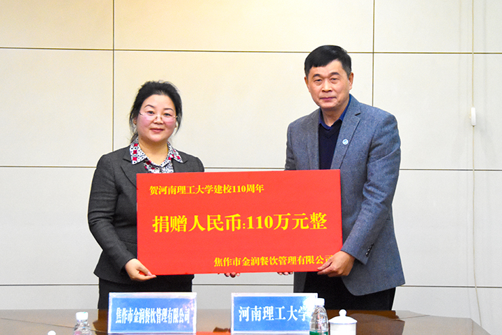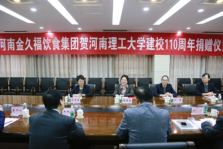 胡朝霞首先代表河南金久福集团公司全体员工,向学校建校110周年致以热烈的祝贺,并向关心和支持公司发展的校领导和广大师生致以最诚挚的谢意。她说,自己和公司能为河南理工大学这样一所百年名校服务,感到非常自豪和荣幸。此次捐赠110万元,用于设立奖学金和支持学校的建设发展,是公司全体员工的一份心意。